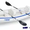 Bow and stern rubber molded handles make transporting boat to and from the water easy and comfortable. Kayak has bow bungees and stern D-rings for attachment of gear. Adjustable and removable foot rest and soft cockpit pads for added comfort when paddling. One benefit of an inflatable kayak is when deflated it folds into a compact size measuring 31″ x 16″ x 10″ (78.75 cm x 40.6 cm x 25 cm) allowing easy storage and security of packing it into a trunk of bed of a vehicle rather than requiring roof racks and exposure to theft. Included with the kayak are a duffel bag with removable shoulder strap, repair kit and owner’s manual.