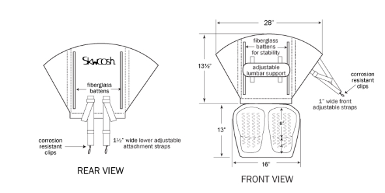 The Comfort Back Support Gel Kayak Seat with Lumbar Support from Skwoosh is specifically designed to help paddlers maintain good posture and enjoy lower back comfort by providing the perfect height, shape and adjustability. The lumbar support pad adjusts to whatever position is needed, allowing you to get comfortable and focus your attention on the ride. Meanwhile, the Skwoosh gel seat relieves pressure on your “sitz” bones. Stay cool and comfortable in this sleek, blue-trimmed kayak seat. Made in the USA. Compare with the Transformer Seat.