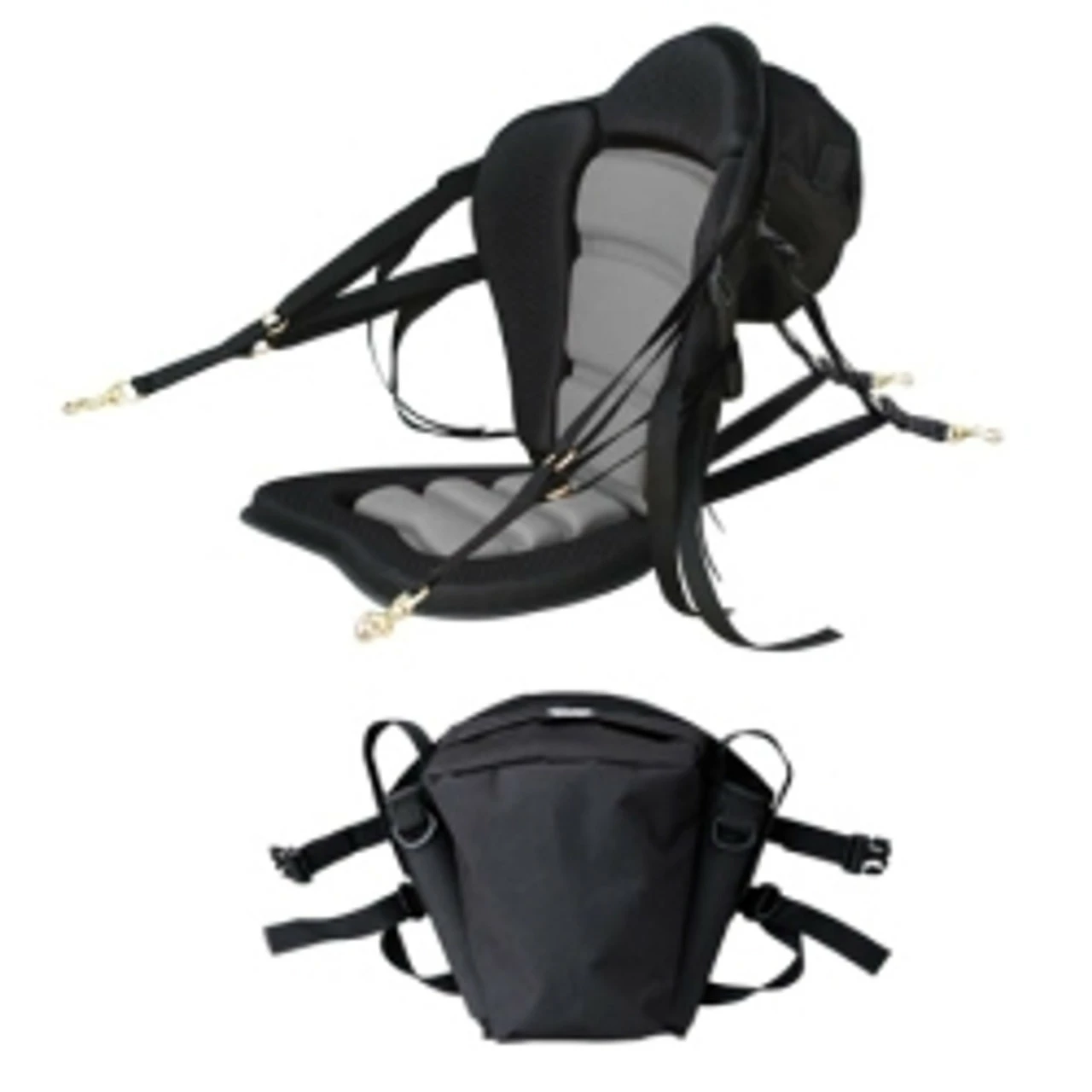 The GTS Elite Kayak Fishing Seat from Surf to Summit sports a generous detachable zipper pack with two solid plastic molded fishing rod holders built right in. The rod holders come with securing straps with velcro attachments that wrap around your fishing poles to add extra security to any rod leashes you may already have. The professional looking Elite was modeled after race car seats and so provides the kayak comfort and support you would expect when sitting in a race car. The thermoformed seat with deep molded center panels contrasting with the surrounding molded, two-tone foam padding provides amazing comfort while the ergonomically sculpted 18” tall back portion of the seat offers maximum high back support.