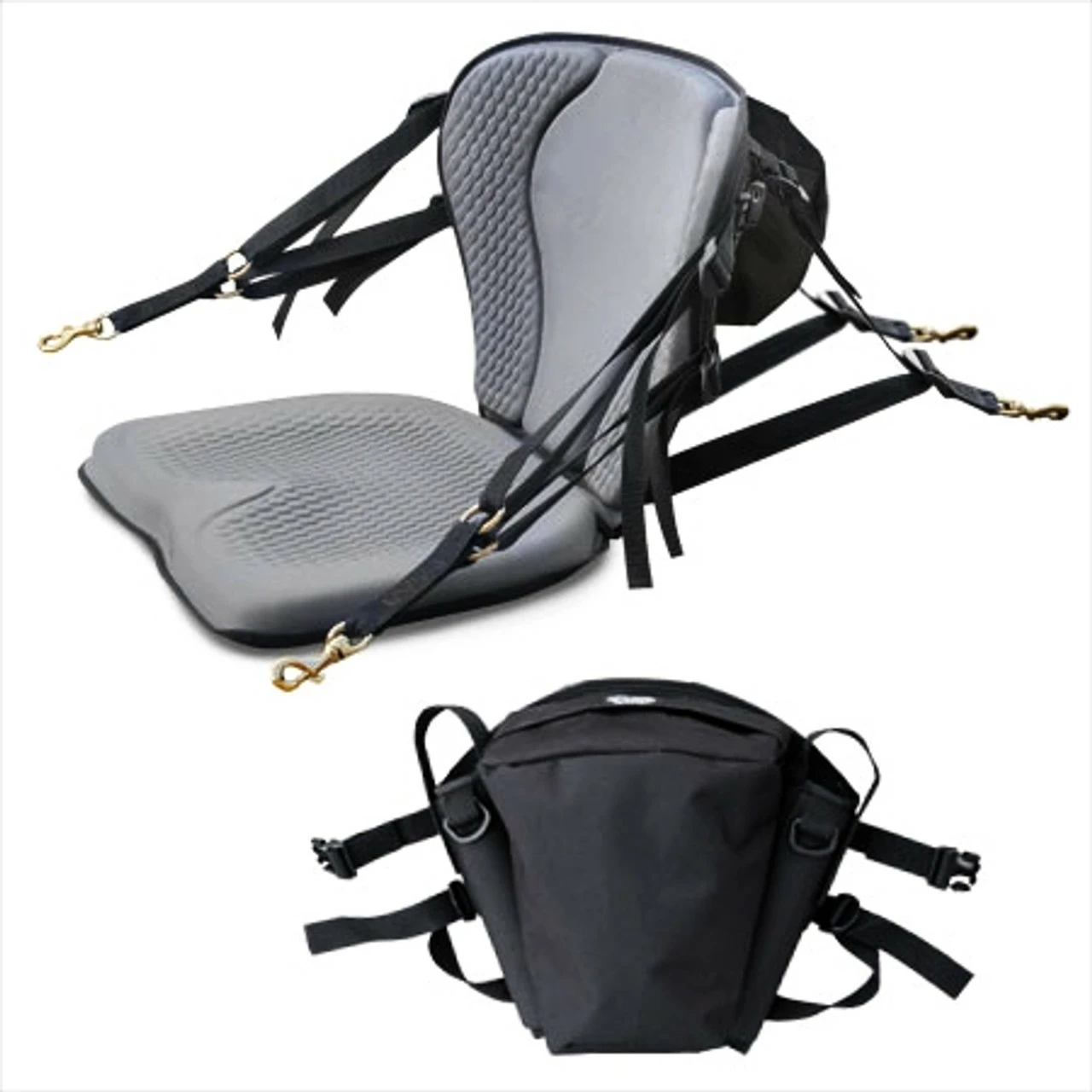 The GTS Pro Kayak Fishing Seat from Surf to Summit includes two solid plastic, molded fishing rod holders with built-in securing straps with velcro attachments in a rear attachment pack unit that includes a generous-sized zipper pack. The new countoured seat bottom with an oversize 2″ thick EVA comfort foam pad will accommodate the larger seat wells common on many of the newer fishing kayaks. The sturdy, tri-laminate backrest allows the angler easier access to the rear tank well and hatch section without sacrificing any support.