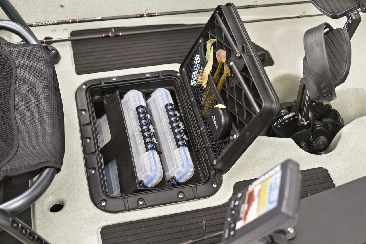 - Rectangular Hatch with Pivoting Tackle Management System – A rectangular hatch just in front of the seat conceals a mesh storage pocket and pivoting storage for two medium-sized Plano® tackle boxes (included). The storage area under the tackle boxes is also easily accessible.