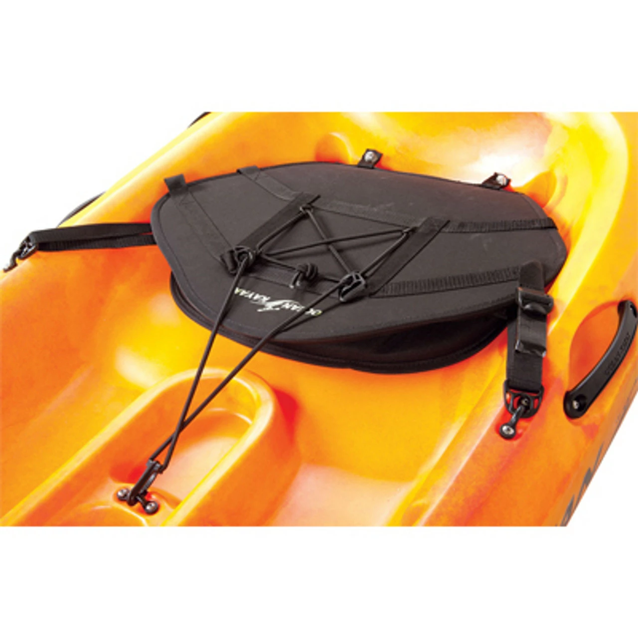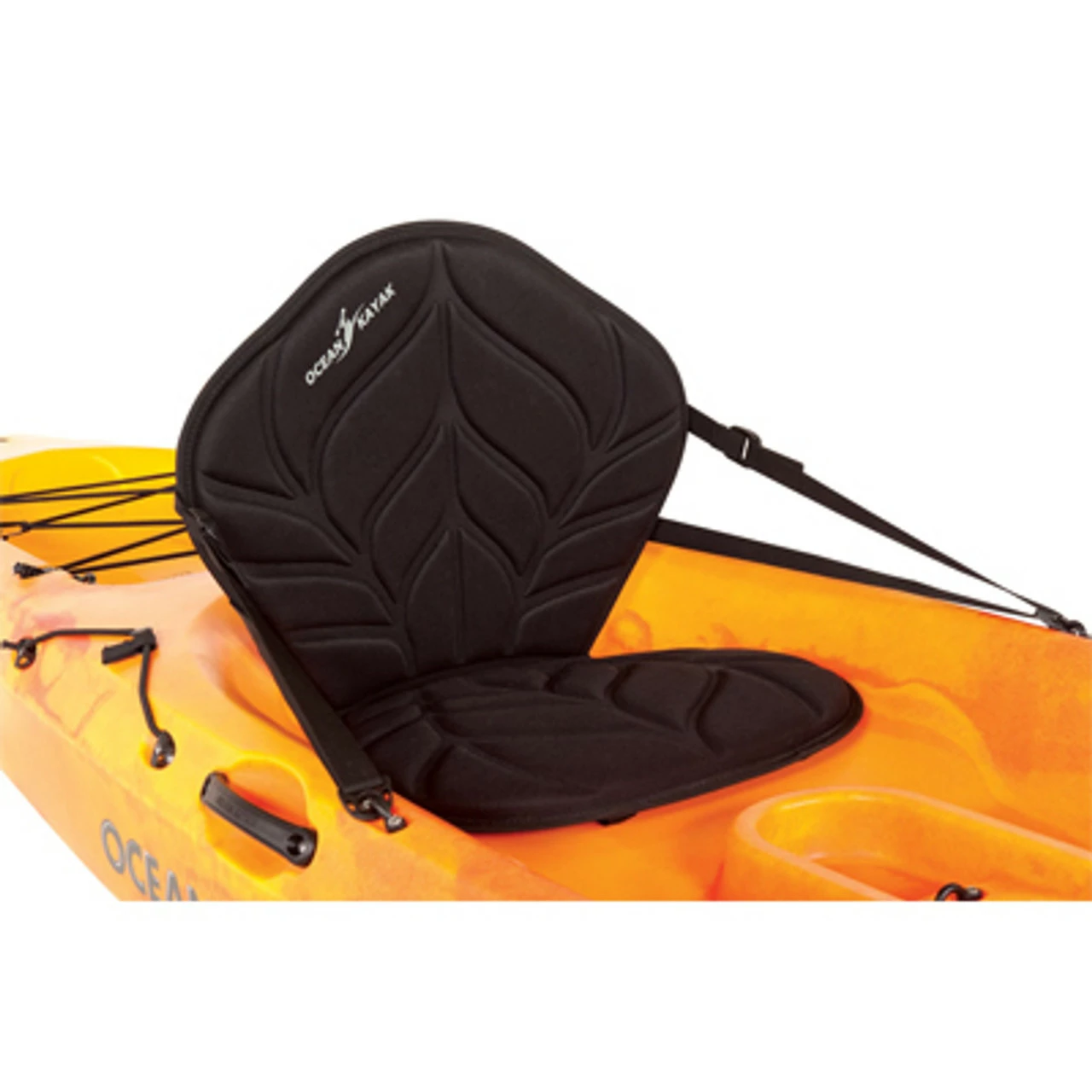 The Comfort Hybrid Seat Back from Ocean Kayak is designed for easy installation and easy removal. With 1/2″ of foam on top of a solid plastic backing wrapped in UV resistant nylon pack cloth, this seat is built durable for long-term wear and tear. With a single bungee strap with a snap-on clip the seat back secures in the rear and can be used to secure the seat in a forward position when not in use. A bungee on the back of the seat allows you to stow your water bottle or other paddling gear. The forward straps adjust with tri-glids and attach with a plastic ring that fits directly onto the pad eyes (deck loops), necessitating removal and re-threading of the straps through the tri-glides. This seat is designed for Ocean Kayak’s Tetra Series and can be screwed directly into the boat (straps not included) at the crease for permanent fixture to prevent the seat from sliding forward. It is thus intended as a replacement seat.