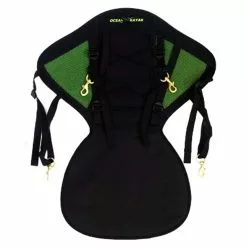 The Seat Back is reinforced with a solid plastic sheet for unwavering back support. On back of the seat back there is a center pocket to store your maps and smaller personal items. On the outside is a bungee-cord lattice system where you could stuff your lunch, your water shoes or other medium sized items. On either side of the pocket is a green mesh for style and fast-drying. Beneath the seat bottom is a rubberized covering that sheds water. Front and back strapping with tri-glides allows you to tighten the seat up to your comfort level.Â